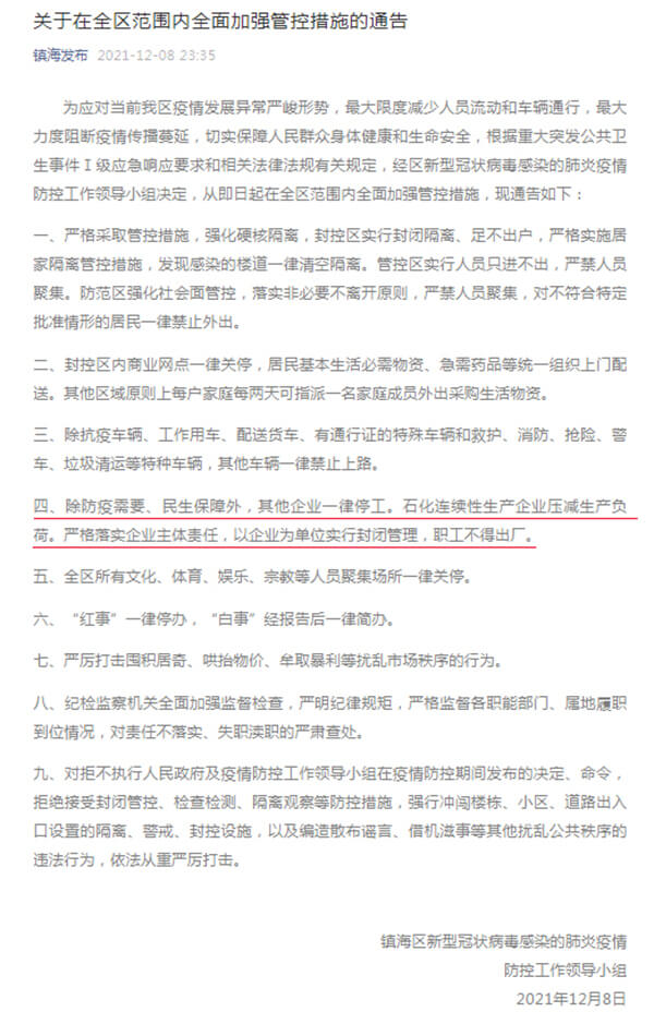 寧波鎮海決定在全區范圍內全面升級管控措施,除防疫需要、民生保障外,其他企業一律停工,石化連續性生產企業壓減生產負荷。嚴格落實企業主體責任,以企業為單位實行封閉管理,職工不得出廠。
